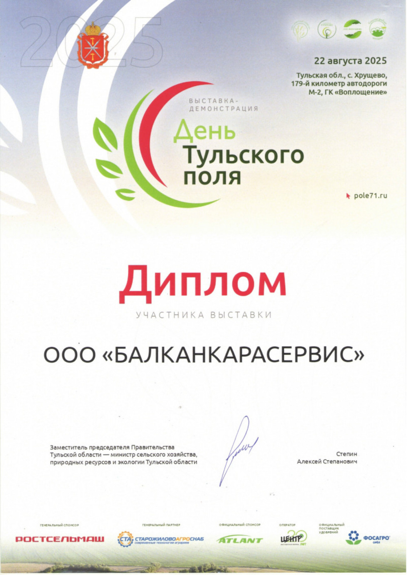 Компания БКС ГРУПП приняла участие в Международной сельскохозяйственной выставке «День поля Тульская область 2025», которая проводилась 22 августа 2025 года в селе Хрущево Тульской области.